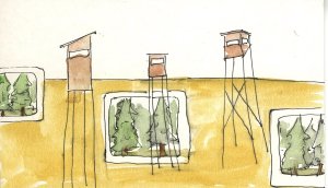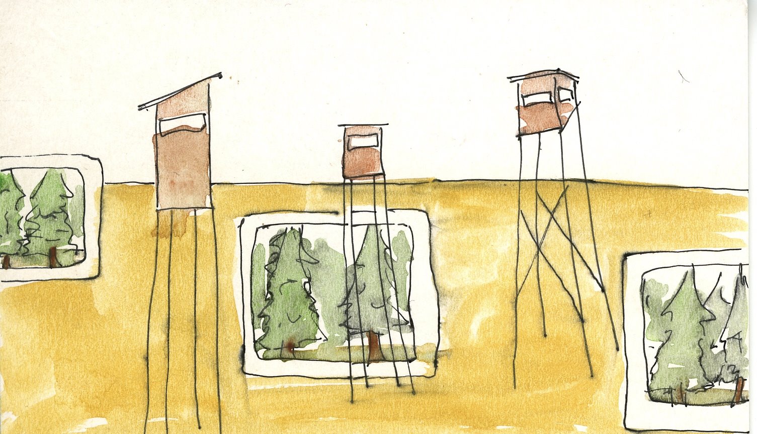 In it I will place 7 bird hides / forester’s hides, standing tall on elongated legs. watchful. Whether they are friend or foe remains open. 7 giants on tall legs viewing over the space. 7 because that is the great number of fables, tales and belief.7 to indicate the quality of my thoughts and search for expression.